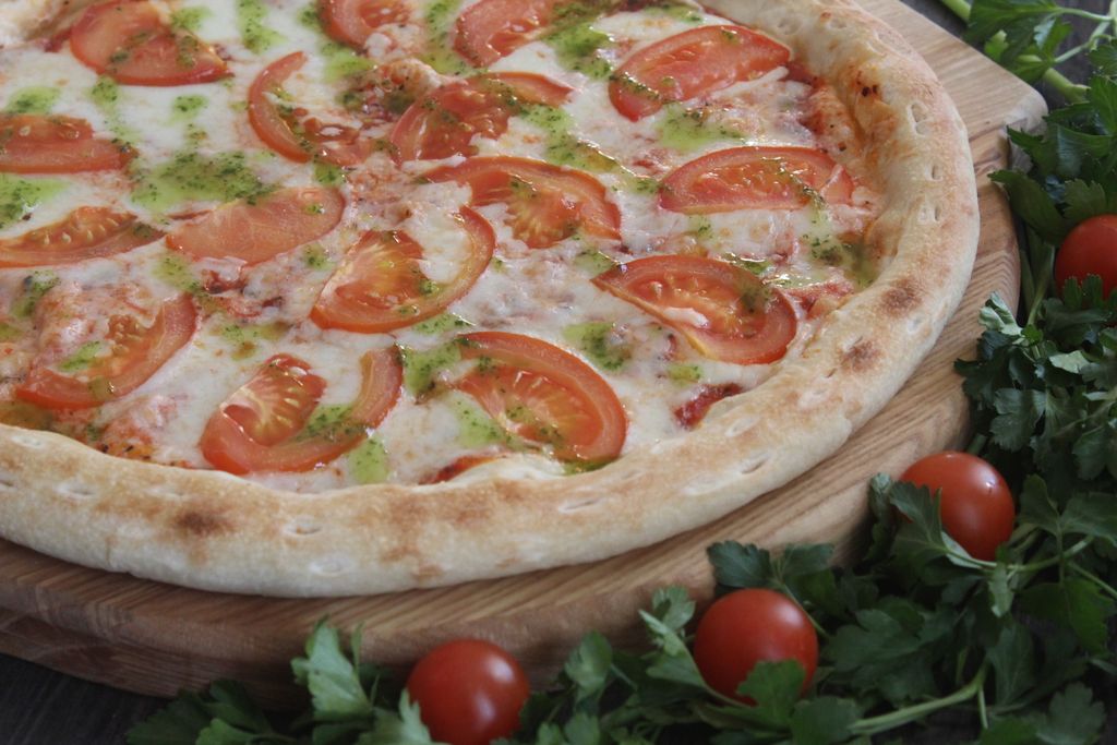 Пицца Маргарита — это классическое итальянское блюдо, которое славится своей простотой и свежестью вкусов. Основой является тонкое тесто, на которое наносится ароматный томатный соус. Сверху щедро посыпается нежная моцарелла, а для дополнительного вкуса добавляются свежие томаты. Завершает композицию соус песто, придающий пицце яркий аромат базилика и орехов. Эта пицца идеально сочетает в себе традиционные итальянские ингредиенты и подходит как для легкого обеда, так и для уютного ужина.