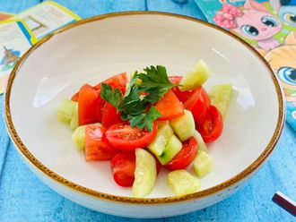 Детский салатик из свежих огурцов и томатов 159 руб. В корзину Томаты, помидорки черри, огурцы, петрушка, масло подсолнечное. Томаты, помидорки черри, огурцы, петрушка, масло подсолнечное. С этим товаром покупаютВ корзинуСырный крем - суп с беконом435 ₽ В корзинуВ корзинуГамбургер детский219 ₽ В корзинуВ корзинуРолл с огурцом349 ₽ В корзинуВ корзинуЧизкейк классический345 ₽ В корзинуВ корзинуМилкшейк шоколадный299 ₽ В корзину